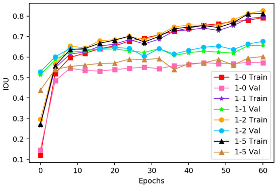 Firstly, the model pays attention to the impacts on segmentation performance. To figure out the influences on segmentation task by mixing detection data, the IOU index is collected over training epochs. The results are presented in Figure 2 and Figure 3. The legend “1-N” means the “1-N Alternation” strategy is employed to train the model. The models were trained and evaluated on the train and validation sets specified in Table 1.