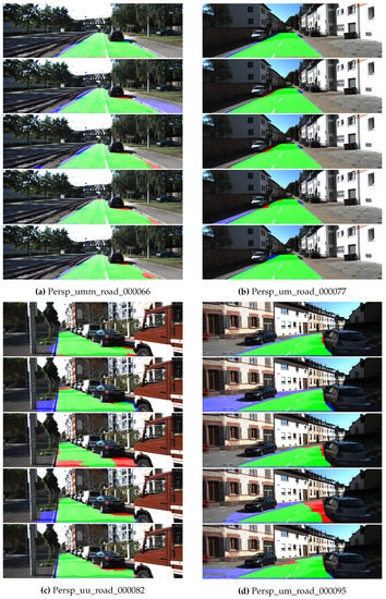- Fritsch, J.; Kuehnl, T.; Geiger, A. A new performance measure and evaluation benchmark for road detection algorithms. In Proceedings of the 16th International IEEE Conference on Intelligent Transportation Systems (ITSC 2013), The Hague, The Netherlands, 6–9 October 2013; pp. 1693–1700. [Google Scholar]