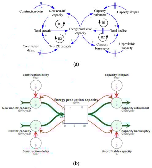 Feedback loops in Figure 1a are taken from Laimon et al. [], which contains two reinforcing loops (R1 and R2), and two balancing loops (B1, B2). Loops R1 and R2 are the inflows; they represent the rate at which new capacity—after a construction delay—comes on-stream. This adds to the total energy production capacity of the Australian energy sector. Loops B1 and B2 are the outflows, reflecting the total decline of both capacities resulted from capacity bankruptcy and capacity retirement. These outflows eliminate unprofitable and retired capacity from the total energy production capacity of the Australian energy sector. Figure 1b is an SFM that translated from CLD Figure 1a. In this example, energy production capacity is the stock; new renewable energy (RE) capacity and new non-RE capacity are the inflows; capacity retirement and capacity bankruptcy are the outflows; construction delay, unprofitable capacity and capacity lifespan are the auxiliary variables.