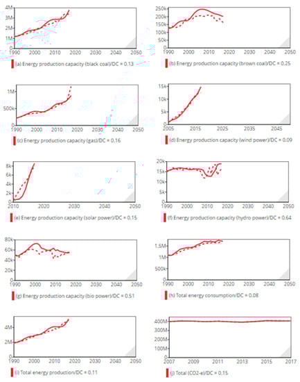 In regard to the behavioural tests, the following points are important: the model should include a number of historical time-periods. The current study used a historical time series consisting of 28 years from 1990–2017 for most resources. The simulated values calculated by the model (blue line) should match these real-world values (red line). This matching can be given a value from 0 (perfect predictions) to 1 (worst predictions) called the discrepancy coefficient. Values between 0.4–0.7 indicate good to average models []. This test has been used for energy production capacity for every resource, total energy consumption, total energy production and CO2 emissions to compare modelled with historical trends between 1990 and 2017 for most resources and between 2007 and 2017 for CO2 emissions due to data availability.