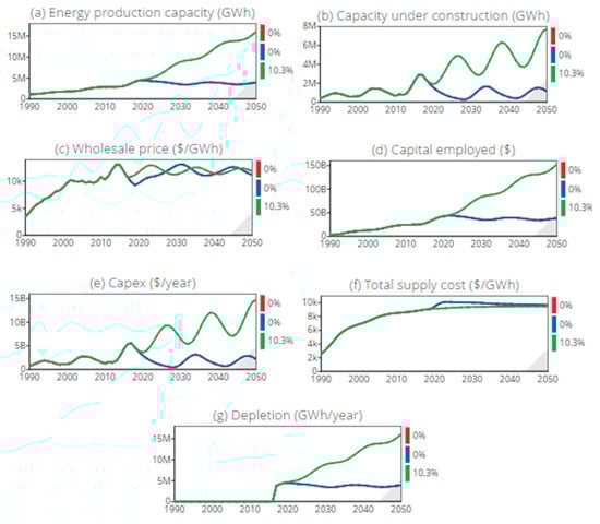 Extreme condition test results for black coal for (a) production capacity, (b) capacity under construction, (c) wholesale price, (d) capital employed, (e) capex, (f) total supply cost and (g) reserves depletion. The coloured lines on each graph represents (1) gross demand growth rate set to 0% (no growth), (2) base case scenario with gross demand growth rate set to 0% (current trend) per year for 2017 and (3) gross demand growth rate set to 10.3% (maximum).