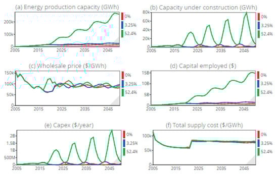 Extreme conditions tests were used to assess the robustness of the SFM under different extreme conditions. For example, (1) the gross demand growth rate was set to (0%, 0%) (no growth) for coal and wind respectively, (2) base case scenario with gross demand growth rate was set to (0, 3.25%) and (3) gross demand growth rate was set to (10.3%, 52.4%) (maximum), to determine their influence on energy production capacity, capacity under construction, wholesale price, total supply cost, capital employed, capex (capital expenditure) and reserves depletion. In addition, we conducted three extreme condition tests for total CO2 emissions for black coal, brown coal, gas and oil. The test scenarios were as follows: (1) gross demand growth rate set to 0% (no growth) for black coal, brown coal, gas and oil, (2) gross demand growth rate set to (0%, −8%, 22.7%, 2%) (current trend) for black coal, brown coal, gas and oil, respectively, (3) gross demand growth rate set to (10.3%, 13.8%, 27.3%, 7.5%) (maximum) for black coal, brown coal, gas and oil, respectively.