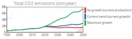 The possible scenarios are as follows: (1) a no-growth scenario that represents current production with no further growth, (2) a base case scenario that represents the current trend (current growth), and no dramatic changes assumed and (3) a likely to happen scenario based on average growth over the last ten years, as described in Table 1. More scenarios could make the analysis unclear. The results of all scenarios are summarised in Figure 10, Figure 11 and Table 2.