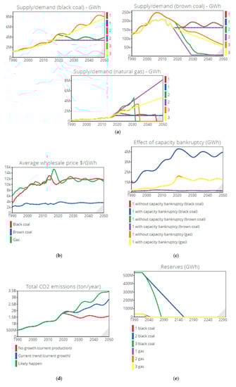 Behaviour over time produced by each development scenario until 2050 for (a) energy supply/demand, (b) average wholesale price, (c) bankruptcy, (d) CO2 emissions and (e) reserves. The numbers on each colour represent (1) no growth scenario, (2) base case/current scenario and (3) likely to happen scenario, as described in Table 1.