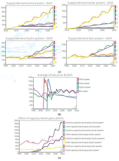 Behaviour over time produced by each development scenario until 2050 for (a) energy supply/demand, (b) average wholesale price and (c) bankruptcy. The numbers on each colour represent (1) no growth scenario, (2) base case/current scenario and (3) likely to happen scenario, as described in Table 1.