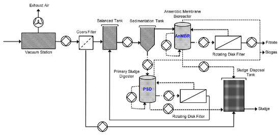 The DWTS analyzed in this study was built in 2009 in Germany. The main objective of this project was to optimize the processes used for decentralized urban wastewater management. The system was designed to treat wastewater from approximately 175 inhabitants. The detailed process flow of the DWTS is presented in Figure 1. During wastewater treatment, sewage was collected from the vacuum station and pumped into an equalization tank, followed by a sedimentation tank, where the solids were settled for separating treatment. The solids, which were up to 1% to 2% of the influent quantity, were treated in a high-load PSD at approximately 37 °C. To make the treatment more efficient, water was removed during the digestion process by a rotating disk filter. Then, water without settleable solids flowed from the sedimentation tank into an AnMBR. Next, the mixed sludge circulated through an external rotating disk filter, which continuously withdrew the effluent from the bioreactor. Fouling control was achieved by rotating the shaft on which the filtration disks were fixed to create a centrifugal force, which caused the solids to flow off. Finally, the treatment divided the wastewater into a solids-free filtrate, biogas from the two anaerobic bioreactors, and stabilized solids after anaerobic digestion (Figure 1).