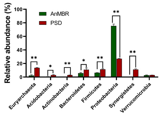 Taxonomic composition of the microbial communities showing the differences between the PSD and AnMBR samples. The data reveal the phylum- and genus-level classification of the 16S rRNA gene sequences. 16S rRNA gene sequences longer than 250 bp were classified using the RDP naïve Bayesian rRNA Classifier at an 80% confidence threshold. Only the relative abundances of the identified phyla higher than 1% are listed. The average ± SD values of the samples in each group are expressed in each column. The significance of the cutoff for the corrected p-value using the Benjamini–Hochberg FDR procedure was set at 0.05. The significant differences within the sampling group are labeled **, where p < 0.05.