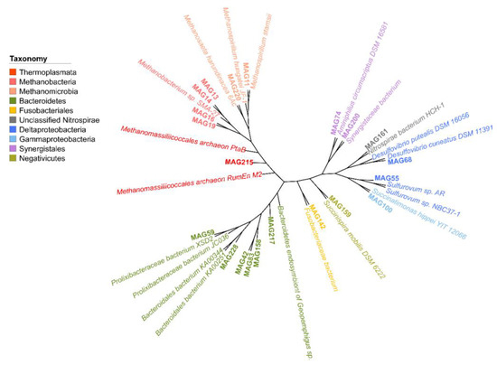 A detailed overview of the taxonomic classification of the MAGs is provided in Figure 3 and Table 2, in which a taxonomic classification with high confidence was possible to the species level for all the MAGs. In summary, 7 MAGs were attributed to the phylum Euryarchaeota, including 4 for Methanobacterium sp. (MAG13, MAG14, MAG16, and MAG19), 1 for Methanomassiliicoccales archaea (MAG215), 1 for Methanosaeta concilii (MAG220), and 1 for Methanomicrobiales archaea (MAG11). The second most abundant taxonomic MAGs classification was Bacteroidales bacterium, with 4 observed MAGs (MAG158, MAG217, MAG228, and MAG42). Furthermore, Synergistaceae bacterium with only 1 observed MAG (MAG200) belonging to the family Firmicutes was recruited from the metagenomic dataset. The remaining MAGs were mainly affiliated with the Aminiphilus circumscriptus (MAG74), Desulfovibrio desulfuricans (MAG68), Fusobacteriaceae bacterium (MAG142), Nitrospirae bacterium (MAG161), Prolixibacteraceae bacterium (MAG59), Succinispira mobilis (MAG159), and Sulfurovum sp. (MAG55) (Figure 3). The relationships between the MAGs and their closest species with complete genome sequences are shown in Figure 3. Most of the recruited MAGs belonged to Methanogenic archaea. MAG13, MAG14, MAG16, and MAG19 were most familiar with the genome of Methanobacterium sp. SMA-27, for which no information regarding its origin is publicly available. The sequences of MAG215 had high similarity with Methanomassiliicoccales archaeon RumEn M2, which has been reported to be a trimethylamine-utilizing archaea [55]. The closest genome affiliated with MAG11 was Methanospirillum hungatei JF-1, whereas the genome of MAG220 was affiliated with Methanosaeta harundinacea 6Ac. During the degradation of complex organic matter to carbon dioxide and methane in anaerobic environments, M. hungatei uses hydrogen or formate to produce methane, which are produced by other syntrophic microbes [56]. M. harundinacea is an acetate-scavenging methanogen isolated from a upflow anaerobic sludge blanket reactor [57]. A Bacteroidetes endosymbiont of Geopemphigus sp. exhibited the highest relationship with MAG158, MAG217, MAG228, MAG42, and MAG83. Prolixibacteraceae bacterium XSD2, Fusobacteriaceae bacterium, Nitrospirae bacterium HCH-1, and Desulfovibrio cuneatus DSM 11,391 were most similar with the genomes of MAG59, MAG142, MAG161, and MAG68, respectively. D. cuneatus is a psychrotolerant sulfate-reducing bacterium isolated from an oxic freshwater sediment [58]. In addition, MAG55, MAG100, MAG74, MAG200, and MAG159 showed the highest similarity with Sulfurovum sp. NBC37-1, Succinatimonas hippei YIT 12066, Aminiphilus circumscriptus DSM 16,581, Synergistaceae bacterium, and Succinispira mobilis DSM 6222, respectively. Sulfurovum sp. NBC37-1 is a chemolithoautotroph deep-sea Epsilonproteobacteria that obtains energy through mesophilic hydrogen- and sulfur-oxidation [59]. S. hippei YIT 12066T was isolated from human feces, and the growth of S. hippei YIT 12,066 T depends on CO2 or bicarbonate [60]. A. circumscriptus is an anaerobic amino-acid-degrading bacterium from an upflow anaerobic sludge reactor [61], and S. mobilis was proven to be a succinate-decarboxylating anaerobic bacterium in a mixed culture growing with glycolate [62].