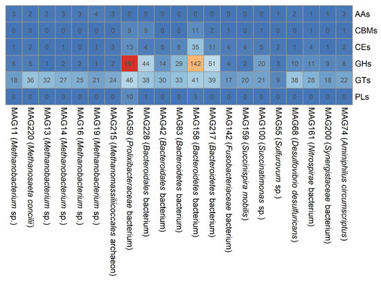 Numbers of genes associated with CAZyme in bacterial and archaeal MAGs.