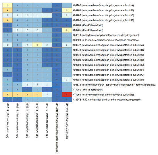 Numbers of genes involved in the relevant hydrogenotrophic methanogenesis pathway in archaeal MAGs.