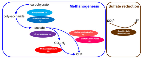 Various microorganisms are involved in and cooperate with each other to achieve methane formation in anaerobic digestion. According to the genome binning presented in this work, members of Bacteroidetes and Prolixibacteraceae were predicted to hydrolyze polysaccharide to acetate. Subsequently, Synergistaceae may oxidize acetate to hydrogen and carbon dioxide. Finally, Methanobacterium sp. was possible to reduced carbon dioxide to methane with hydrogen as the primary electron donor. Furthermore, sulfate was likely to be removed through desulfurization with the help of Desulfovibrio desulfuricans (Figure 6).