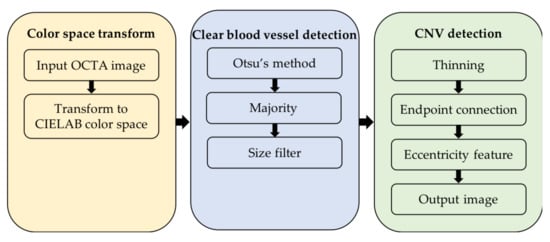 Schematic diagram of each step process. The original image uses the CIELAB transform to extract the L channel, removes noise after passing through Otsu’s method, Majority, and Size filter, and finally finds CNV through thinning, endpoint connection, and eccentricity feature.