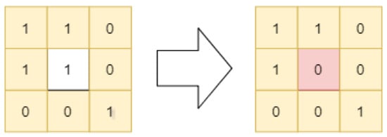 The schematic diagram of majority. There are only four white pixels (value equal to 1) among the eight pixels, so it will be set to black (value equal to 0).