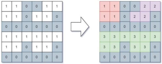 The schematic diagram of connected-component labeling. Mark the connected white pixels (value equal to 1) with the same color and label numbers.