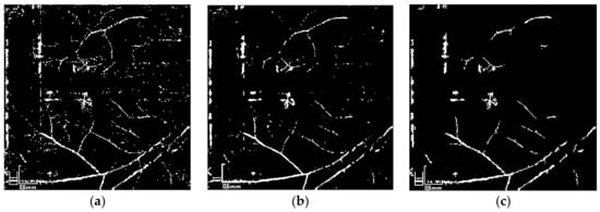 An example of clear blood vessel detection: (a) Otsu’s method; (b) Majority; (c) Size filter.
