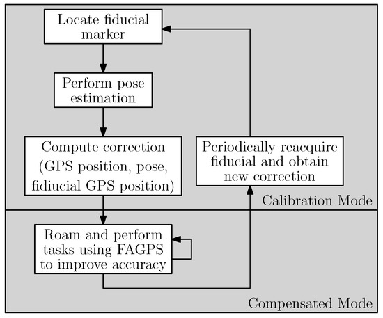 Fiducials have previously been used in GPS-denied environments to augment odometry and inertial navigation systems (INS) to facilitate more accurate navigation through association with a ground-truth [17,18,19]. In contrast, we propose to use fiducials regions in non-GPS denied environments to improve GPS accuracy by reducing errors associated with time-variant variables for a short period of time. Our technique, FAGPS (Fiducial Augmented GPS), which augments traditional GPS data with position data acquired from a stationary geo-referenced fiducial marker. Hence, for a time interval in the order of 20–30 min a more accurate position determination is achieved. We validate FAGPS through empirical studies and simulation based on corrections of GPS data for stationary and moving GPS receivers.