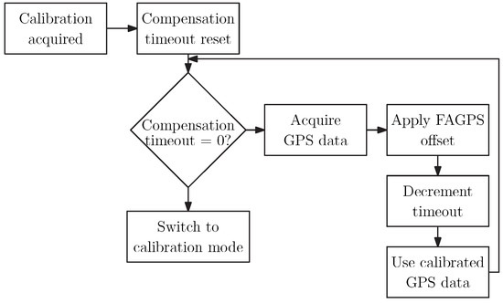 Once these calibration coordinates have been captured the robot will operate in the compensated mode as outlined in Figure 3. In the compensated mode the FAGPS acquired calibration offsets are applied to all new GPS data to improve accuracy. It is expected that the area of operation will be relatively small (as this is primarily designed to improve the navigation performance for small unmanned robots), so an area of operation within 10 km should be reasonable.