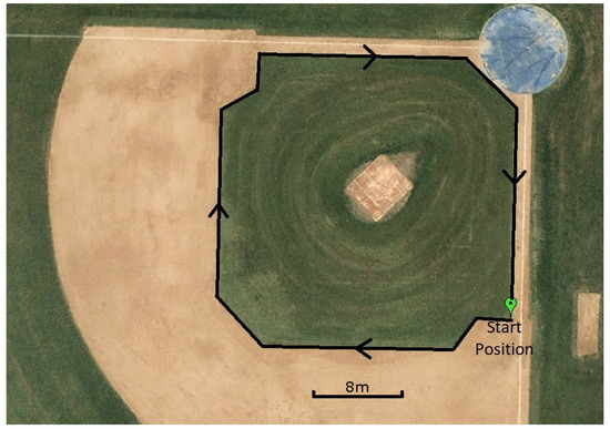 The aim of the final experiment was to assess the performance of the FAGPS approach for a moving target, as would be expected in a field robotics application. A base-ball diamond area was chosen as it has a well defined shape which varies in latitude and longitude. The start position (marked in Figure 5) was where the compensation on a geolocated point was performed. The experiment involved traversing around the edge of the grass in a clockwise direction as a speed of approximately 1.2 m/s. A total of 26 laps of the baseball diamond were performed over a period of 30 min.