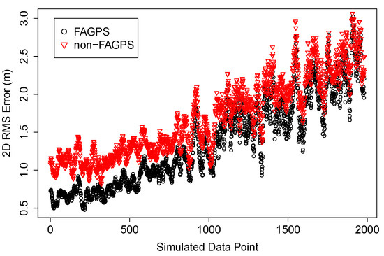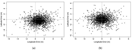 Figure 6a,b show the simulated error present for latitude and longitude for the non-FAGPS and FAGPS simulated data sets respectively. Visually it can be observed that although the datasets have a similar precision, the FAGPS dataset has significantly better accuracy.