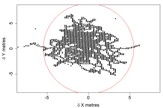 The error over the 44 h test can be quantified using the 2DRMS error which is a way of expressing 2D GPS accuracy. 2DRMS is computed as double the square root of the average of the squared errors. For the 44 h test 2DRMS = 5.457 m.