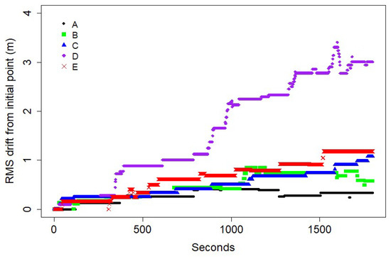 The drift in the results for the latitude, longitude and altitude is shown in Figure 8. This drift may initially seem very large, but it is taken over a period of over 44 h and is within the standard specified operational accuracy for traditional GPS systems.