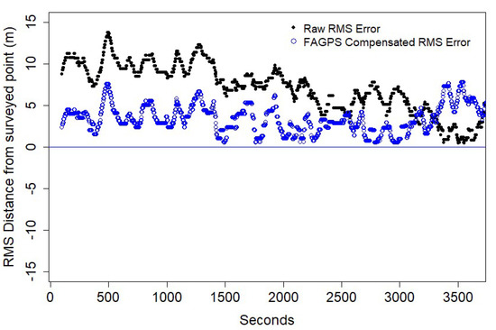 Figure 11 shows the horizontal RMS error of the raw GPS measurements in comparison to the FAGPS compensated measurements. The first 100 s have been excluded as these represented the time taken to move from PCM113580231 to PCM113580230. The first 30 min show a consistently smaller RMS error for the compensated data. Past the 30 min mark the compensated data provides less value in terms of increasing accuracy which we propose is due to the fact that the compensated values are time dependant and having aged are no longer accurate. This aging of the compensated values has several components including atmospheric conditions, potential multi-path effects and swapping between different satellites. At this point in time a fiducial marker could be reaquired to give a more accurate position estimation.