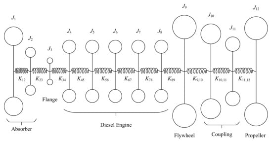 The model studied in this paper is based on a typical marine diesel engine propulsion system mainly consisting of a vibration absorber, engine cylinders, a flywheel, a transmission shaft, a coupling, and a propeller, as shown in Figure 1.