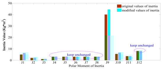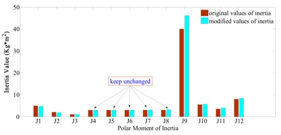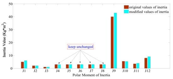 In Figure 5 and Figure 6, the obtained results of modified inertias and stiffness are shown respectively. The arrows in the figures indicate that the values of the inertias and stiffness are almost the same before and after modification.