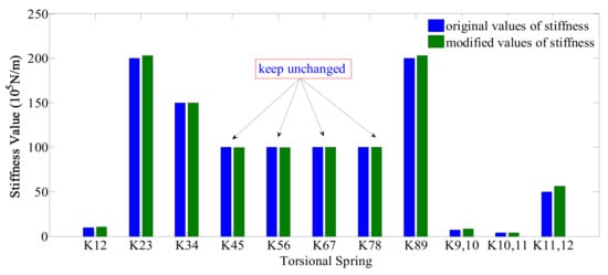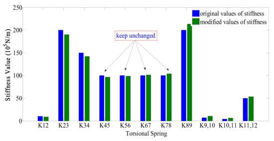 Compared with the above two cases, the third and fourth frequencies of Case Three are required to become 55 Hz and 70 Hz. As shown in Table 6, the actually achieved values are 55.06 Hz and 70.04 Hz, respectively. Unlike the previous two cases, the physical constraints in the third case become more stringent, which requires the inertias and stiffness of both the engine and the propeller to remain unchanged. Figure 7 shows that the inertias that are not allowed to be modified are indeed kept unchanged. As shown in Figure 8, the stiffness parameters for the engine before and after modification are not exactly the same, which is similar to the inertia parameters; especially, stiffness K45, K56, and K67 have some errors. However, they are very small and acceptable. Therefore, the solution for modification is effective. This case further illustrates the universality of the method.