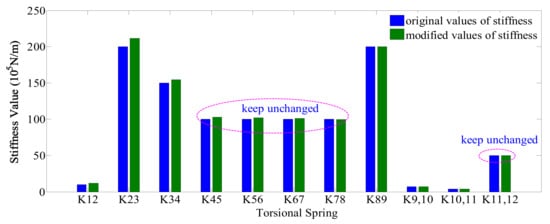 As shown in Figure 3, the differences between the inertia values before and after modification regarding the inertia of a diesel engine are small and can be considered to be almost identical. Figure 4 indicates that the stiffness parameters for the engine before and after modification are not exactly the same, which are similar to the inertia results; especially, stiffness K45 and stiffness K78 have some errors, but they are very small and acceptable. Therefore, the solution for modification is effective.