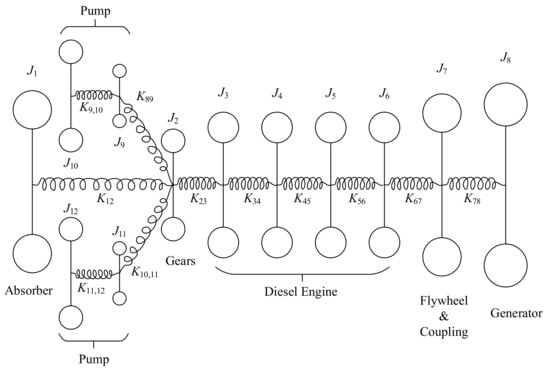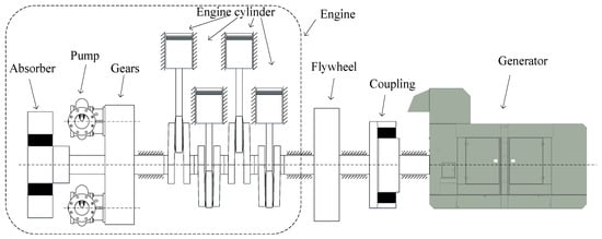 In this section, a diesel generator set is taken as the research object, which consists of a vibration absorber, two pumps, gears, engine cylinders, a flywheel, a transmission shaft, a coupling, and a generator, as shown in Figure 9.