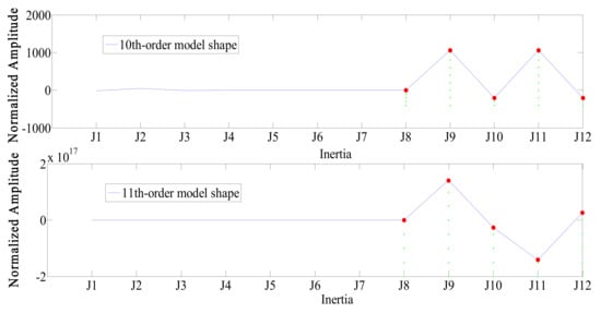 From Table 8, it is found that the system has close eigenvalues, such as the 10th and 11th natural frequencies. The corresponding modes are given in Figure 11. From Figure 11, it can be concluded that the mode shape corresponding to the 10th natural frequency represents synchronous vibration, while the mode shape corresponding to the 11th natural frequency is asynchronous vibration. It is also clear that the modal amplitudes of inertias J9 and J11 are much larger than those of other inertias when the shafting is vibration in either of these two modes. As a result, once resonance occurs at these two frequencies, the equipment represented by these inertias can undergo large vibration and thus probably serious damage. Therefore, it is necessary to avoid these resonances.