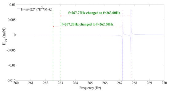 In this case, it is assumed that the speed of the shafting system is 948 r/m, so that 15.8 Hz is the main shafting excitation frequency. It is important to prevent the excitation frequencies from coinciding with the natural frequencies of the system. So, the 17th harmonic frequency (268.6 Hz) needs to be avoided, and for this purpose, the 10th and 11th natural frequencies of the original system will be moved to 262.5 Hz and 263.0 Hz while keeping the others unchanged, as shown in Figure 12 corresponding to the 10th frequency (267.20 Hz) and the 11th frequency (267.77 Hz) shown in Table 8.