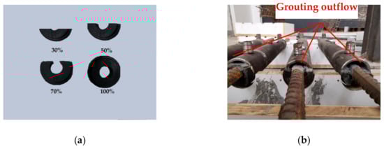 Settings of the grouting density: (a) cut rubber plugs; (b) sleeve locations where the grouting flowed out.