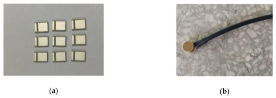 Lead zirconate titanate (PZT), the most common piezoelectric materials, has been widely used in structural health monitoring (SHM) due to its low cost, high bandwidth, fast response, and dual capability of actuation and sensing [,]. PZT-based stress wave method is an advanced active energy harvesting and sensing testing method []. The propagation distance between stress waves in the structure is large, and the detection range is broad. Additionally, many types of excitation signals exist, and many signal characteristics can be analyzed by using different modalities. Therefore, this method has been used for integrity assessment, health monitoring, and damage detection in civil engineering. Roh et al. [] first used a PZT transducer and proposed the stress wave method in structural health monitoring. PZTs embedded in a structure emit and receive stress waves according to the direct and inverse piezoelectric effects of the piezoelectric materials. Structural damage is detected by establishing the relationship between the piezoelectric wave signals and the structural working states. Song et al. [,] proposed the “smart aggregate,” which embed PZT pieces in marble to better adapt them to the high-salinity environment of concrete materials, and successfully applied it in the early-age strength monitoring of concrete, impact detection, and structural health monitoring.