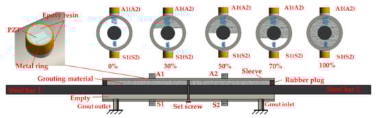 In the test for the grouting compactness detection of sleeves, the grouting compactness was controlled by the cavity areas of the rubber plugs, as shown in Figure 2a. The rubber plugs were placed at the ends of the sleeve and then the grouting material was poured. Excess grouting material flowed out from the notch of the rubber plugs to control the compactness, as shown in Figure 2b. The PZT patch used in this experiment is type PZT-5, with a size of 8 × 6 mm and a thickness of 1 mm. The material properties of the PZT are shown in Table 1. To ensure that the PZT transducers operated normally without being affected by the external environment, they were completely encapsulated with epoxy resin in the metal ring to protect them and the connecting wires, as shown in Figure 3. The schematic of the specimen is shown in Figure 4. Four transducers (i.e., actuator and sensor) were bonded to a predetermined position on the outer surface of the sleeve with epoxy resin to form two pairs of transmitting-receiving groups (i.e., A1S1 and A2S2). The distance between sensors and set screw were set as 80 mm. The length of the sleeves was 380 mm, and the diameter and thickness of the tendon duct were 51 and 4.5 mm, respectively. The length and diameter of the steel bars were 400 and 20 mm, respectively. During the experiment, the grout inlet and outlet of the sleeve were fixed with the ground; the ends of the steel bars were free. Three groups of 15 sleeve specimens were prepared in total. The cement used for grouting in this study was a high-strength micro-expansion grouting material specifically used in sleeve grouting connections. At the beginning of the study, the material properties of the grout were tested. The performance indices are presented in Table 2. The results satisfied the requirements of the code [].