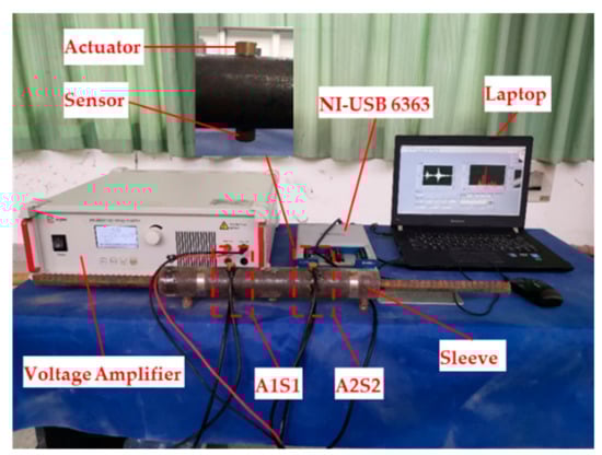 After 28 d, the sleeve grouting compactness experiment was conducted. As shown in Figure 5, the experimental instruments included a real-time data acquisition system (NI-USB 6363), a single specimen, a voltage amplifier and a laptop with the LabVIEW software installed. Excitation signals were applied to the PZT-based actuator using the LabVIEW program to generate stress waves. Additionally, the signal response of each PZT sensor was recorded. The excitation signals were sine sweep signal. It was found that the signal energy was concentrated at 50 kHz–100 kHz by pre-scanning before the test began, while the signal energy was lower when it was out of range of 50 kHz–100 kHz, making it difficult to correlate with the grouting compactness of sleeve. Therefore, the frequency range of the test was set as 50 kHz–100 kHz. In order to increase the accuracy of the original signal obtained from the PZT sensor, each specimen was scanned for 5 consecutive times. Therein, each interval time and collection time were set as 10 s and 1 s, respectively. In addition, the amplitude of the signal was 10 V. The sampling frequency of each channel was 1 MHz. The voltage amplifier amplifies by 10 times.