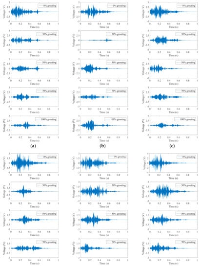 For WPE, both the wavelet basis and decomposition layer may affect the detection result []. The results obtained by using different wavelet bases for the same signal are often quite different. In addition, the number of decomposition layers is too small and the denoising effect is not ideal, while too large decomposition layers will lead to the increase of computation and serious information loss. In this paper, since wavelet basis sym8 has the characteristics of compact support set, good continuity, and symmetry, sym8 is used to identify grouting compactness by trials. In terms of the decomposition layer, when the decomposition layer was set as five, the fifth layer signal had serious information loss. Therefore, in sym8, the decomposition layer was set as four.