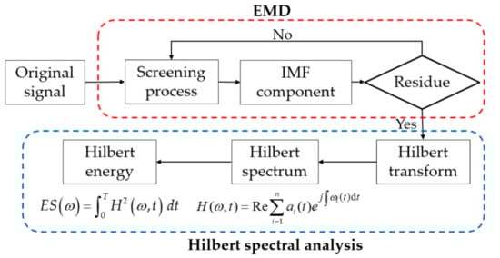 The HHT is a signal time-frequency processing method []. In the HHT, the intrinsic mode function (IMF) obtained via empirical mode decomposition (EMD) reflects the inherent physical characteristics of the original data. Compared with the wavelet packet energy method, a basis function is not required. However, each IMF must meet the following conditions: (1) the sum of the positive and negative values of the function must be the same as the zero-crossing point, or at most, they differ by one; (2) the upper and lower envelopes formed by the extreme values have an average value of zero []. The HHT can adaptively localize the signal from the characteristic time scale of the non-stationary signal. The acquired piezoelectric signal is transformed to depict its Hilbert energy spectrum, where the energy accumulated by each frequency is expressed over the entire length of time [,]. In addition, the Hilbert energy is more concentrated than the wavelet energy.