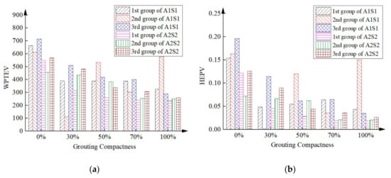 The relationship between the values of the grouting compactness and the proposed indices was established, as shown in Figure 8. The WPTEV and HEPV measured via the WPE and HHT methods, respectively, clearly exhibited relationships with the grouting compactness. With the increase of grout compactness, the compactness index signatures decrease, indicating that both signal-processing methods can be used for detecting the sleeve grouting compactness.