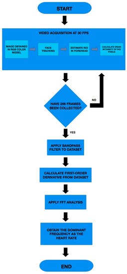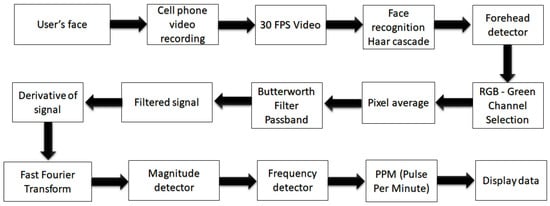 For the development of the application, it was necessary to declare the permissions and the corresponding validations to make use of the camera of the phone. These permissions must be executed at the beginning of the application. The first step is to obtain a video of 30 frames per second (FPS) with a resolution of 640 pixels × 480 pixels with a Red, Green, and Blue Channels (RGB) color model for the formation of real color images. We positioned an image acquisition box in the central part of the forehead, because this is a region of the human body that has a wide and uniform area, from where the necessary information to process can be acquired. The methodology involved in the estimation of the heart rate, through our application, is displayed in Figure 1.