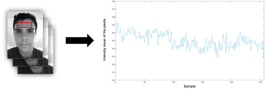 For each frame that is obtained during video processing, a tracing of a region of the face is performed using a Haar cascade classifier based on the location of reference points, such as eyes, nose, mouth, and face contour. The cascade classifier used in the face tracking step has shown great performance and stability in object detection when a correct configuration is made [10]. Once the box on the top part of the forehead is obtained, as shown in Figure 3 (left side), the average intensity of the pixels analyzed in the green channel of the RGB model over the specific region or area is obtained, as shown in Figure 3 (right side).