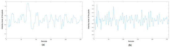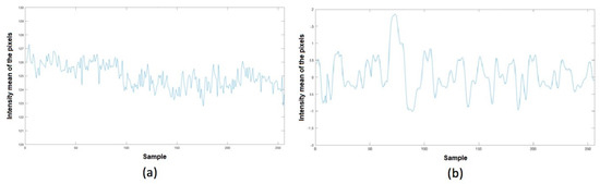 Once the values associated with the intensity are acquired, they are stored in an information vector for further processing. The next step is to apply a 5th order bandpass Butterworth filter with a frequency range of 0.5 Hz to 3.1 Hz to eliminate any other unwanted signal that could affect the correct interpretation of the information associated with the cardiac pulse. Figure 4 describes the relationship between the obtained signal (a) and the filtered signal (b).