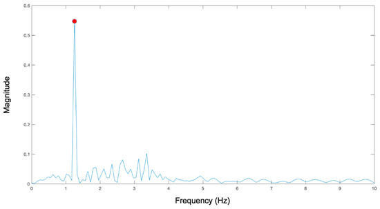 The following procedure is used to apply the fast Fourier transform algorithm to convert a signal in the time domain and transfer it to the frequency domain to find the central frequency and carrier of the information signal and, with this, to obtain the number of estimated heartbeats per minute. The frequency with the highest magnitude of Fast Fourier Transform (FFT) data will be related to the cardiac frequency of the user, as clearly observed in Figure 6.