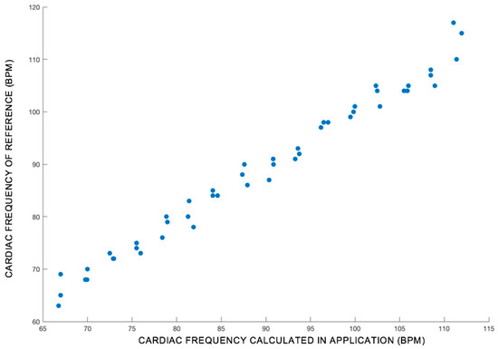 The Bland–Altman method was used as a graphic method to compare the two measurement techniques acquired from the same quantitative variable (in the present investigation, this variable is heart rate). This method measures the difference between the acquisition method of a medical pulse-oximeter compared to our application. Figure 8 shows the graph with the Bland–Altman method to quantify the average between both methods, obtaining more than 95% reliability in the data obtained, thereby verifying the variability and precision of the techniques.