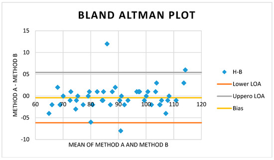 We can observe in Figure 8, through a visual impression of the Bland–Altman graph, that the data obtained by our application, in comparison to the reference device, have high precision. Most of the data are within the agreed limits, thus validating the certainty and precision of the technique used.