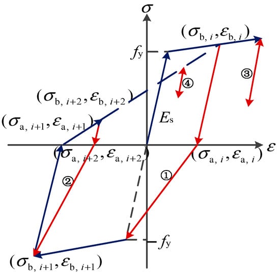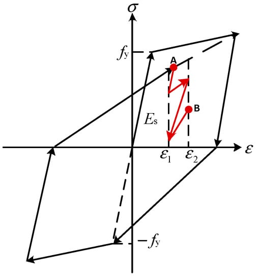 The loading and unloading rules of steel proposed by Clough [] shown in Figure 2 are used, which can effectively consider the stiffness degradation during the loading and unloading process. In this study, the rules are appropriately simplified and corrected to address the numerical stability problem and the inherent deficiency in the model. In particular, the unloading is considered to be an approximately linear elastic process, the corresponding calculation is based on the initial elastic modulus Es, and the stress associated with the reverse reloading (shown as ① and ② in Figure 2) is calculated using the following equation.