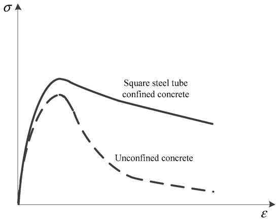The constitutive model of concrete confined by a square steel tube from Reference [] is implemented, as shown in Figure 4. This model can be expressed by the following formula.