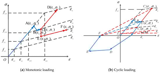 As shown in Figure 5a, loading is assumed to be carried out at a relatively high strain rate to point A, where the strain is higher than the elastic ultimate strain under the quasi-static strain rate and lower than the elastic ultimate strain corresponding to the current strain rate. When the strain rate drops suddenly to and loading continues to point B, the strain at this point is , which exceeds the elastic strain corresponding to . This is a process in which the elastic deformation at high strain rates is transformed to elastoplastic deformation at low strain rates. After loading continues at a strain rate to point C, the following situations may occur: ① when the strain rate increases to , the loading first goes elastically along the path from point C to point D. The loading then continues at the strain rate along the hardening skeleton curve to failure. ② When the strain rate decreases to , considering that stress relaxation may occur during the process from high-speed loading to low-speed loading, in which case the strain remains the same, the stress first decreases from point C to below E, and loading is carried out at the strain rate along the direction from point E to F of the skeleton curve to failure.