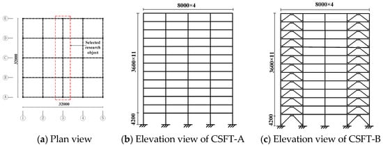 A 12-story CFST frame is selected as the exemplar structure. The structure has a height of 4.2 m for the first story and a height of 3.6 m for each of the other stories, totaling 43.8 m. The plan view and elevation of the structure are shown in Figure 6. The seismic fortification intensity is 7 and the designed basic acceleration of the ground motion is 0.15 g (as specified in []). The floor/roof dead load and live load are set to be 4.5 kN/m2 and 2.0 kN/m2, respectively, which are converted to the density applied on the floor/roof slabs. A 140 mm-thick slab with a concrete strength grade of C30 (i.e., a nominal cubic compressive strength of 30 Mpa) is used for both the floors and the roof. The transverse and longitudinal steel beams are Q235 (i.e., the yield strength of steel is 235 Mpa) I-beams that have cross-sectional dimensions of 700 mm × 300 mm × 13 mm × 24 mm. The CFST column has cross-sectional dimensions of 500 mm × 500 mm, with a tube of Q345 steel and infilled concrete of strength grade C30. The thickness of the steel tube is 20 mm for the columns in stories 1 to 5 and 15 mm for the columns in stories 6 to 12. The planar frame along grid line 3 is used for analysis. CSFT-A is an ordinary CFST frame, and CSFT-B is a CFST frame with BRBs in each end bay.